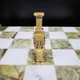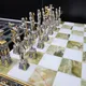 Поле шахмат выполнено из редкого и благородного оникса, сочетающего в себе оттенки белого и глубокого зеленого. Доска и фигуры, отлитые из бронзы, вручную расписаны серебром и золотом, придавая им неповторимый блеск и роскошь. Каждый элемент выполнен с исключительным вниманием к деталям, что делает эти шахматы настоящим шедевром.